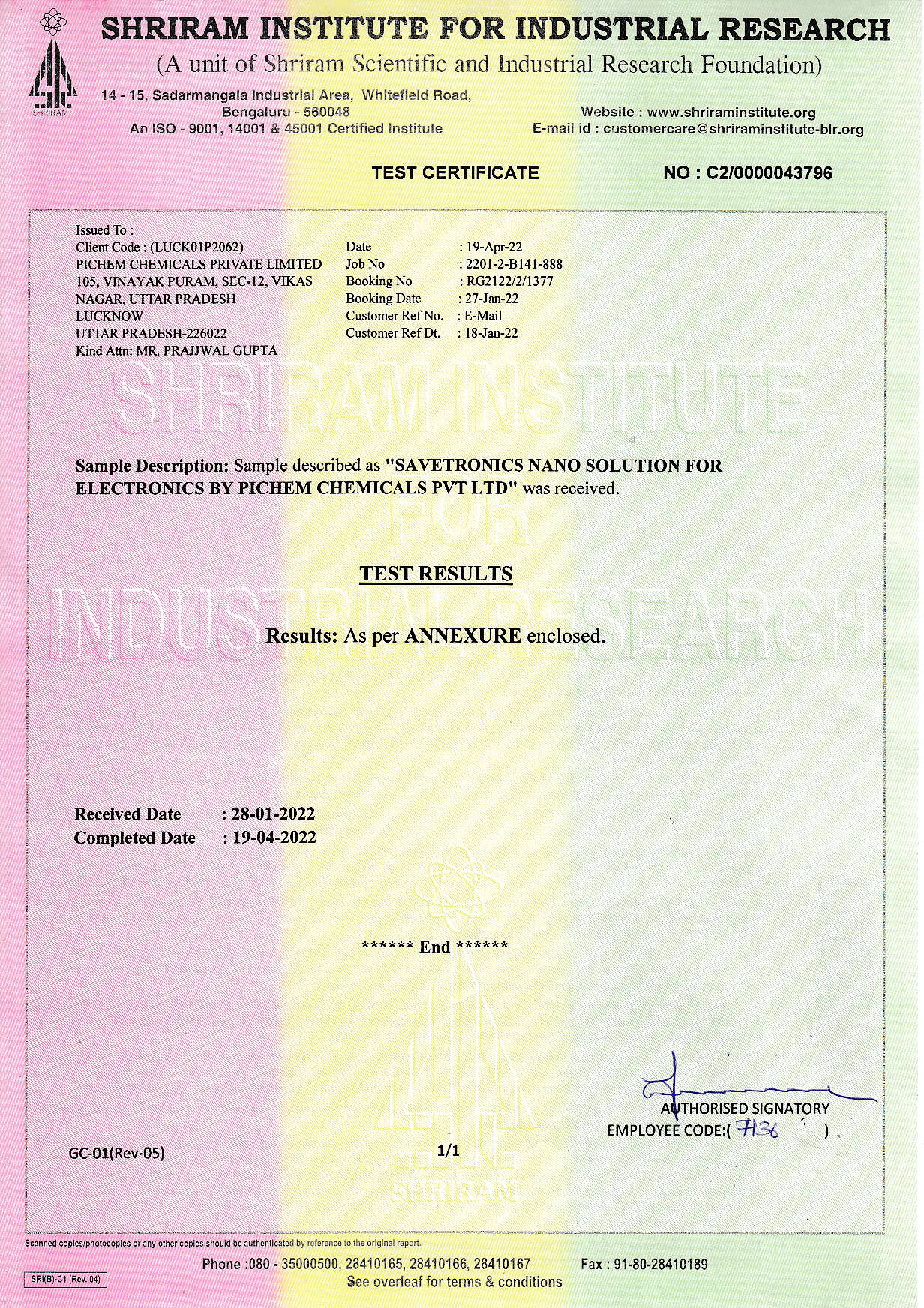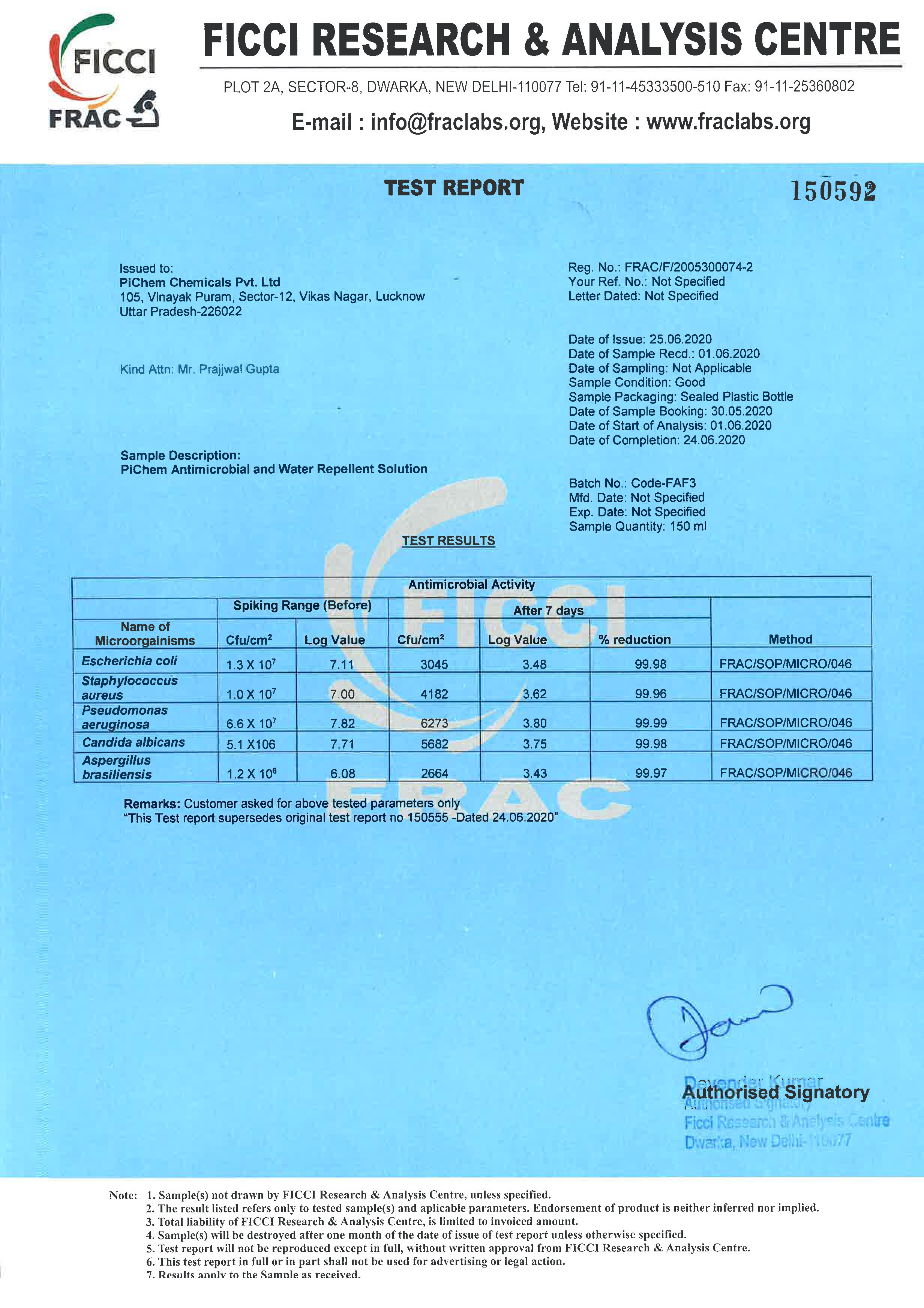 - ICMR recommended and NABL certified anti-microbial test report (as per USP Chapter 1072)
