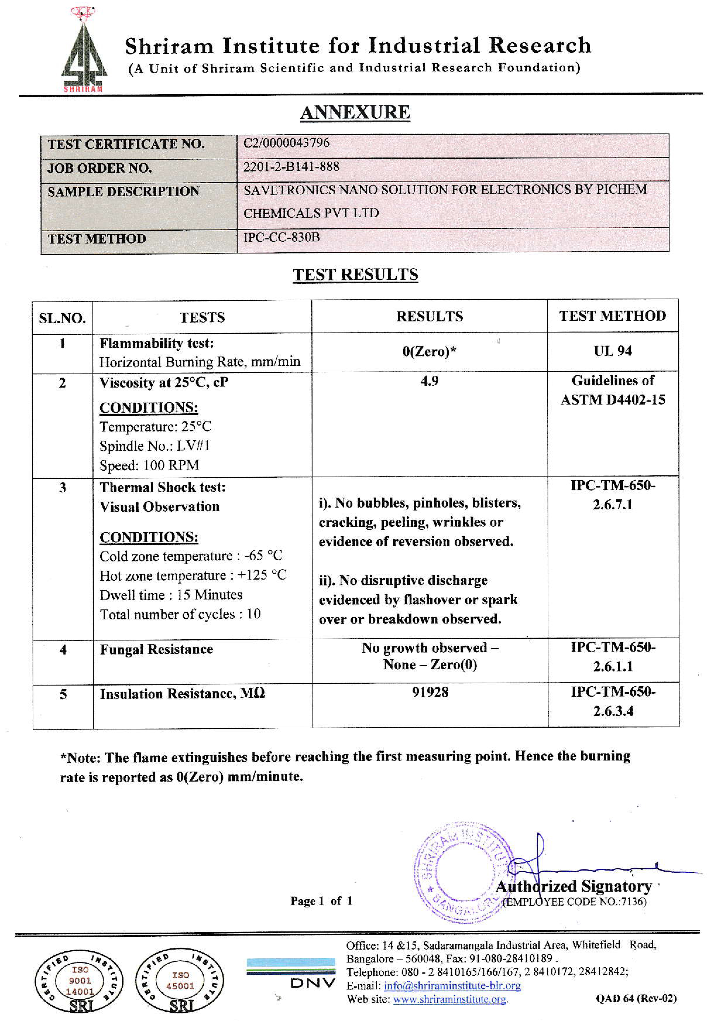 - Military grade test report (as per IPC-CC-830B formerly known as MIL-I-46058C)